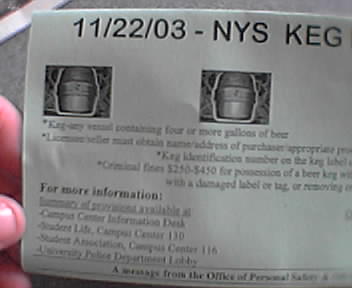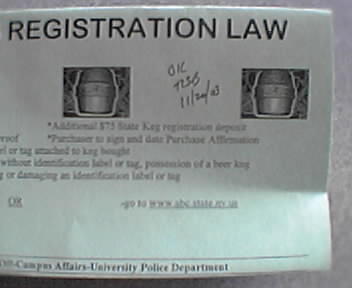 ![]() ![]() According to the New York State Division of Alcoholic Beverage Control, the Keg Registration Program is part of a continuing effort to prevent underage alcohol consumption. The new law requires anyone purchasing a container of four or more gallons of beer to leave a $75 deposit in addition to charges they would normally pay for a keg. Additionally, anyone who doesn't return a keg within 30 days of its purchase will lose the $75 deposit. www.abc.state.ny.us |