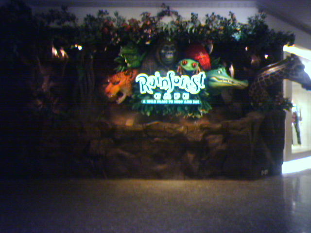 ![]() ![]() ![]() ![]() Went out to the Rainforest Cafe last night for dinner with Alan and his girlfriend who are up here so he can interview for a job. It was surprisingly good given it was a restaurant in the mall. I highly recommend the pot roast. The ambience was pretty cool too, with the occasional "thunderstorm." I now know why that section of the mall rumbles from time to time. |