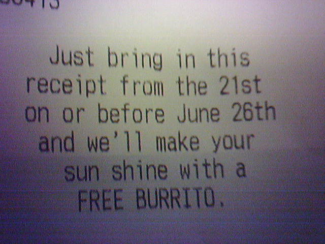 | Free burritos! Tue 06.21.05 10:50am PDT #14118 |
