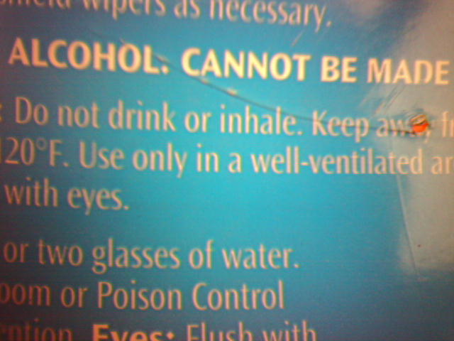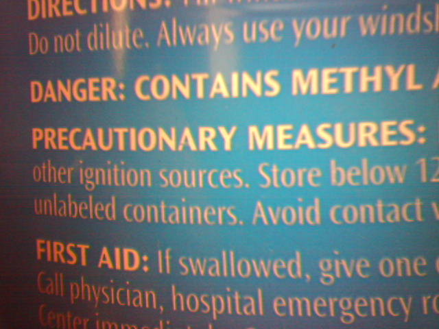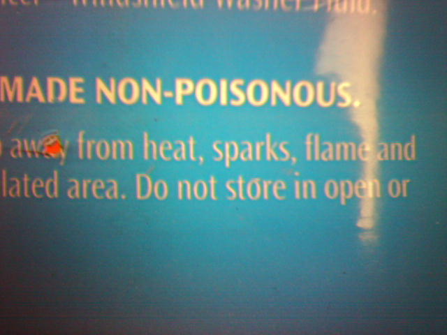 ![]() ![]() ![]() ![]() I got this free bottle of rain-x deicer windshield wiper fluid when I bought new wiper blades. Noticed an interesting warning on it. Apparently this stuff is flammable? And I'm supposed to put it in the wiper fluid reservoir right next to the engine? Automobile engines don't count as "heat, sparks, flame, or other ignition sources", do they? -div |