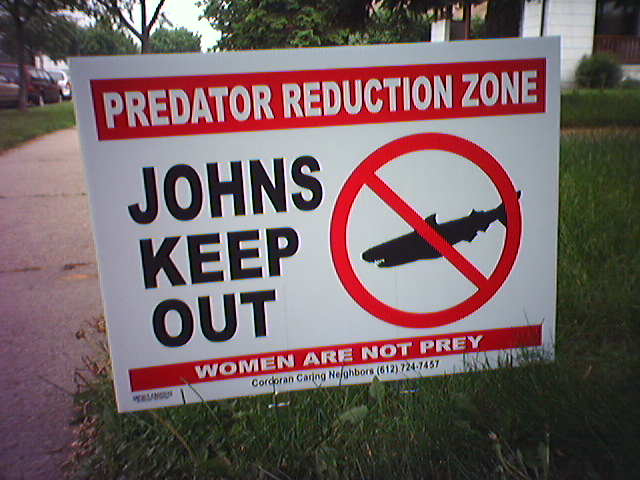 apparently the prositutes, Johns and pimps have moved off of lake street in south minneapolis,Mn and have been 'working' the residential neighborhoods that surround the area (for some time now). The corcoran neighborhood association has issed these signs to the local residents to fend them off. The signs are starting to pop up. this sign was directly accross from South High School.. AIM~~ FreeToBeBad |
