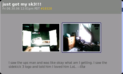 ![]() ![]() Haha so I know I had old posts on here somewhere just to many damn pages to check. So I googled my old tmail and hN popped up which was just what I hoped for. So it took me all the way to page 535 and 2 years back in time =]. Here's a screenshot of when I first received my SK3 which I was dying for at the time haha. Also another one of when David Blaine was in that sphere of water. Good times with that sidekick 2 and tmail =/ -- Sent from my T-Mobile Sidekick® |
