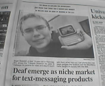 Woke up this morning to see an almost 1/2 page writeup talking about the recent advantages enjoyed by deaf people with the newest generation wireless devices. Bryan Blaisdell is the person in the picture. I don't know if he hangs out on photoblogging sites, but his picture does now! Michael (wireless) IM: mwsmith70 |