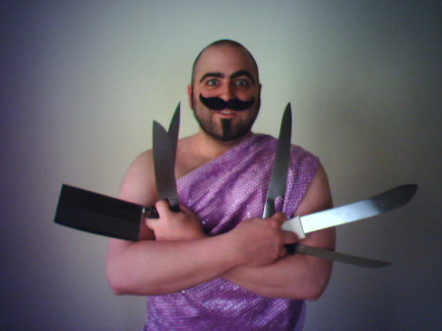 ![]() ![]() ![]() ![]() A great benefit of the rennovations going on in our house is that rooms are being emptied out to be painted. This leaves, for example, our dining room open to use as a temporary photo studio for the next few months. So today I'm doing two set-ups for the project where we are illustrating the history of Trixie Little and Monkey. The first scene of this not-so-usual day at home is of evil Uncle Tosso posing with knives. Next up this evening is a group photo of a circus family... - mike lee - baltimore, md |