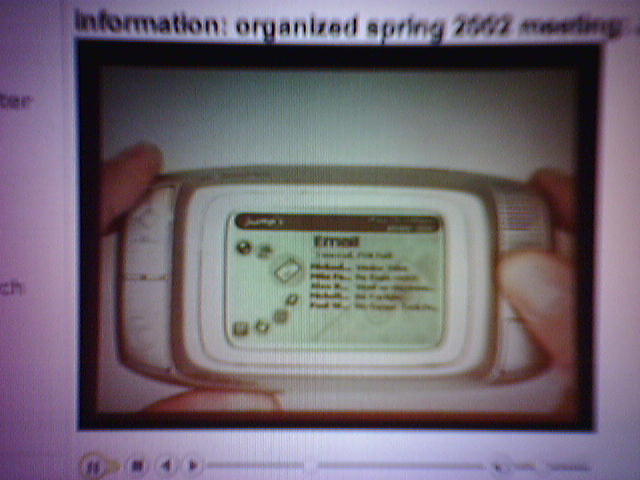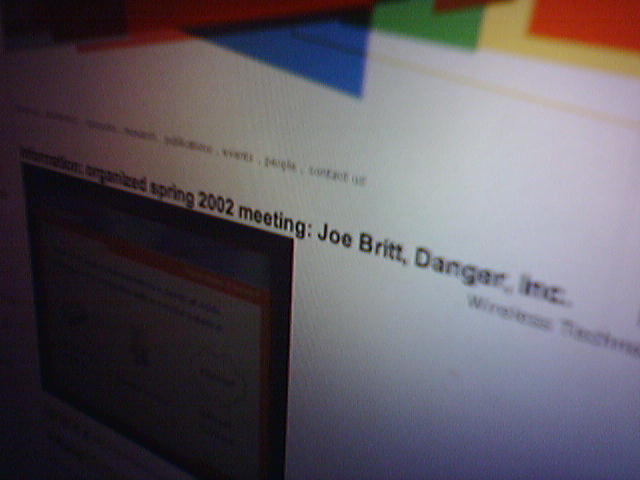 ![]() ![]() ![]() ![]() ![]() I was skimming through the sponsor extranet of the Media Lab tonight and noticed a 35-minute RealVideo from May 2002 of Danger co-founder Joe Britt giving a presentation of the first Hiptop and the Danger (Backend) Service. I don't know why I didn't notice this video a year ago when I got my account--maybe they just added it. Joe demoed the Hiptop UI and basic apps on a protoype HT1 using an overhead Elmo video camera which sent video of the device to the Bartos Auditorium's huge video screen. As always, the audience let out a collective gasp and applauded when Joe first flipped open the Hiptop screen to reveal the keyboard. Besides the cool cartoon at the end of the PowerPoint, it was all information we know now. The business propositions Joe described are still compelling and relevant today. - mike lee - baltimore |