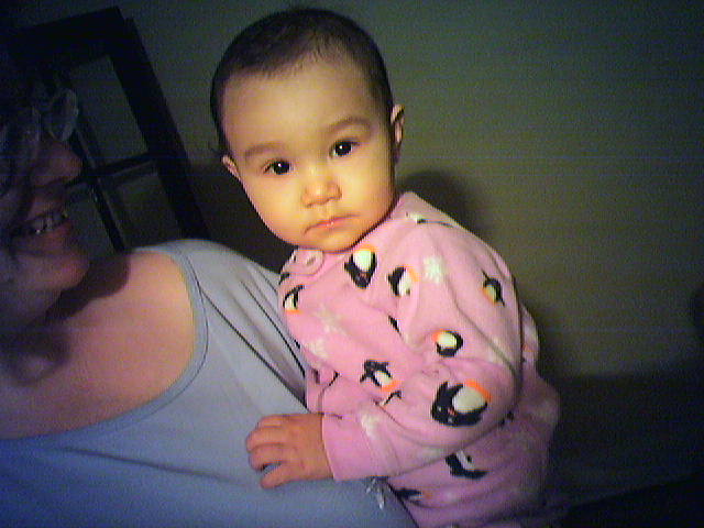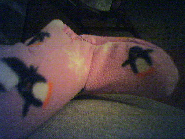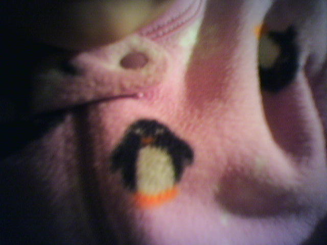 ![]() ![]() ![]() Cianna models her new purple penguin Pro Fleece Sleeper, which we bought at Baby Gap today. While the little penguins in the print don't exactly match the Linux Tux, I still think this outfit qualifies as baby geek chic. By the way, you generally can't tell from the photos, but usually when I photographing Cianna from up close, she's swatting at the phone cam or trying to grab me for a hug. This really challenges one's photo technique. - mike lee - baltimore |