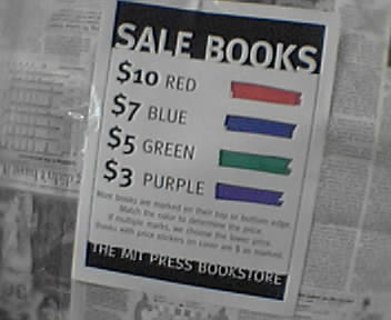 ![]() ![]() ![]() ![]() ![]() After checking in at the Cambridge Marriott, I walked out the rear of the lobby out onto Main Street for some fresh fall air. I immediately felt a great disturbance in the force coming from the direction of MIT Press Bookstore. Nothing seemed unusual as I paid for a copy of Ellen Lupton's new book Thinking With Type: A Critical Guide For Designers, Writers, Editors, & Students. But glancing at a flyer on the counter, I realized the source of the disturbance: The Fall Loading Dock Sale was in progress behind the bookstore! I followed the yellow and black arrow signs to discover thousands of books on sale for up to 95% off. I fought off an involuntary seizure and didn't pick up any more books. Instead, I cashed out with a bunch of Maeda-designed MIT t-shirts which were priced at $3 each because the logo was off center. The normally $20-a-piece shirts will get shipped back by FedEx. Now, I'm drinking coffee at the Au Bon Pain before venturing back out to walk around until the 7pm wine tasting reception at the Lab. - mike lee - cambridge, ma |