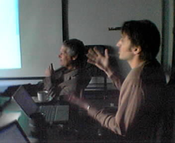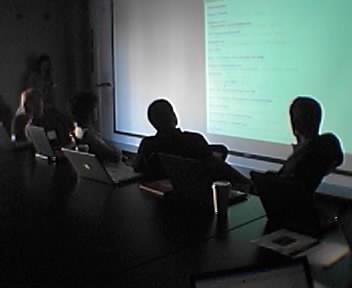 ![]() ![]() ![]() Cameron Marlow(at far right), inventor of Blogdex and Walter Bender are giving a presentation on the current types of "emergent intelligence" systems, where the opinions of large, independent groups of people are used to aggregate decisions or collectively build things. Examples shown included Smaller Picture, Wikipedia, Flickr and del.icio.us. - mike lee - cambridge, ma |