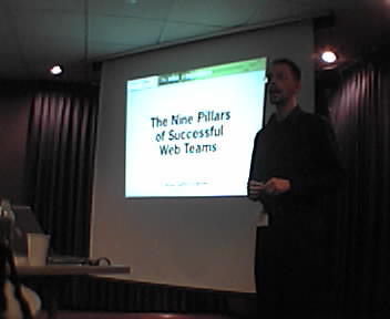 ![]() ![]() ![]() ...to our web team on the Nine Pillars of Successful Web Teams. As he explains each of the kinds of competencies required, he's pausing to engage in dialogs with our various team members on how they do their work. - mike lee - washington, dc |
