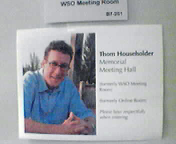 A new sign appeared on the door of our office's meeting room today: Thom Householder If you could spend just five minutes with Thom Householder, which is now not possible since he has moved to Italy with his wife, you would feel like he has been your friend for years. Thom's southern charm and subtle wit would help anyone get through the toughest day. We miss you. - mike lee - washington, dc |