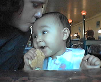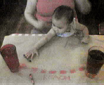 At Rock Run tonight, we marked Cianna's Reach Radius on the paper table cover to prevent her from pulling another glass of water into her mommy's lap. This tactic will work until she begins to crawl and climb, which is not long from now. - mike lee - baltimore |