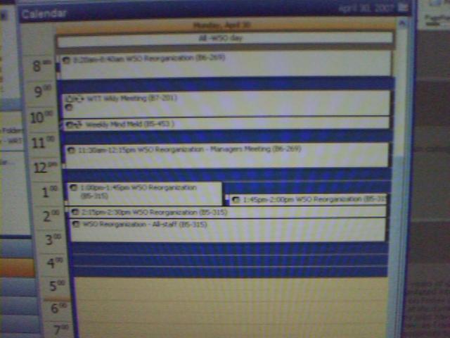 ![]() ![]() ![]() ![]() ![]() ![]() After several delays over a period of six months, the day of the reorganization of our web team arrived today. The specifics were very closely held until today--even for management. At 8:25am, in a private meeting with my boss and two reps from human resources, I was told my job will be eliminated as of June 1. I got a thick folder of unemployment fact sheets and job descriptions of new positions to which I could apply. I had five more meetings with various groups until 3:30pm during which time I learned the big picture of the changes. 19 jobs were eliminated, including my entire group of 13. 24 new positions were created and 10 people were spared. The eliminated were encouraged to apply for one or more of the new jobs by May 8. If I don't get re-hired, I can work until July 1 and then be given a severance package, which for me would be four weeks of pay. The 20+ consultants in our group are not affected for now. My guess is that I have a good chance of getting re-hired in some capacity or another because I'm assigned to so many large projects and work groups that they would be mildly F-ed if I walked. And all this is after two of my colleagues in senior management resigned two weeks ago. Lots to think about over the next few weeks. The last two photos are a reminder of why I am doing all this. - mike lee - washington dc |