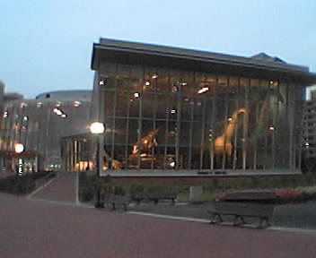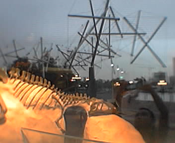 The Science Center's tensegrity sculpture and me (lower right) reflected in a window of the Dinosaur Mysteries exhibit. - mike lee - blogging every half hour for 24 hours for project blog 2004 |