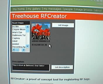 ![]() ![]() ![]() ![]() ![]() ![]() I got a chance yesterday to hook up the RFID proof-of-concept kit that was given to me at last month's MIT Media Lab sponsor workshop. I unpacked the tag reader device and AC adapter from the chinese takeout container, and plugged it into the network and a power ports by my desk at work (pics 1 & 2). Then in a web browser I logged into a special demo area in the lab's Treehouse system to register my tag reader hardware, upload some images, and associate them with stick-on ID tags (pic 3). I affixed the tags to color laser printouts of the three photos I uploaded (pic 4), and placed each page into a sheet protector. When I waved one of the tagged photos over the reader (pic 5), the device flashed an LED and emitted a beep in confirmation of successfully reading the ID number. Immediately, the captioned digital image stored in the asset repository of Treehouse was highlighted and zoomed larger on screen (pic 6). The demo worked as planned and I now have a tiny extension of the Media Lab on my desk. Admittedly, affixing unique RFID tags to prints in a photo album is a stretch in terms of practicality. However, this concept demo does send my mind racing into future applications for inexpensively tracking the location of, and managing the metadata for physical objects via the Internet. - mike lee - washington, dc |