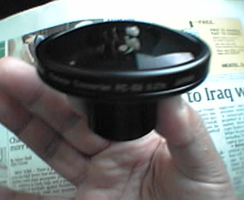 ![]() ![]() ![]() ![]() ![]() ![]() I had the forehead-slapping realization last night to hold my Nikon FC-E8 0.21x fisheye converter lens over my phonecam module aperture. It's awkward to manage but works! This lens is sold as an add-on to the Nikon Coolpix 900 series of digital cameras, and used for trick photos and to capture superwide source images for iPix and QuickTimeVR 360 degree panoramas. The $125 (street price) lens is a massive multi-element dome of glass that sees an amazing 180 degree field of view. As you can see in the first photo, the lens' rear element is an almost ideal size for manually positioning over the phonecam lens. The last two frames are a self-portrait and forward shot made in the cramped seating of a commuter train. In the first fisheye shot, you can see the conductor in the view and passengers standing *directly* to my left. In the second, my fingers holding the edge of the lens are visible. Other digicam manufacturers such as Olympus and third parties like Raynox make add-on lenses like this one in various focal lengths. If you shop around, you can find used or discontinued items for pretty cheap. Needless to say, look for more fisheye shots in the coming days, and I'll probably start investigating other lenses to see how well they work with the Sidekick/Hiptop camera. This technique should also work with many other phonecams. OK, my train has arrived in DC-- later. - mike lee - |
