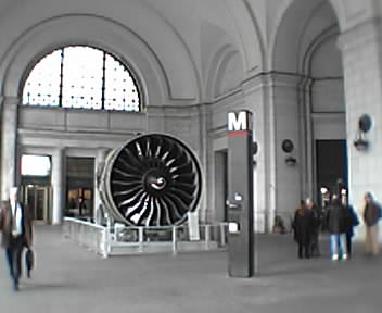 ![]() ![]() ![]() ![]() I did a double-take when I saw a jet engine outside of one of the entrances to Union Station this morning. Was this some new homeland defense scheme? No, the display is part of this week's General Electric technology expo. The Guiness Book of World Records says the GE90 is the world's most powerful jet engine. It stands 13 feet high by 25 feet long and weighs 20,000 pounds. It has the power to blow two-ton boulders about as if they were pebbles. It is indeed a beautiful piece of machinery. - mike lee - washington, dc |