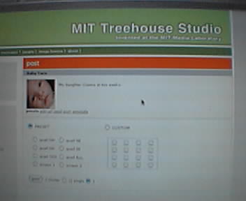 ![]() ![]() ![]() I just remembered that I had some baby pictures stored in the MIT Treehouse Studio, an experimental art creation and community platform I've been testing. My PowerBook is on the lab's WiFi network, so I logged in and pushed a picture to the iMac cluster video wall. Yes, that's my little girl Cianna's face diced up in software and displayed across a bunch of refurbished computers. It's nice to be able to refresh the screens from anywhere in the world, but even nicer to see it in person. - mike lee - |