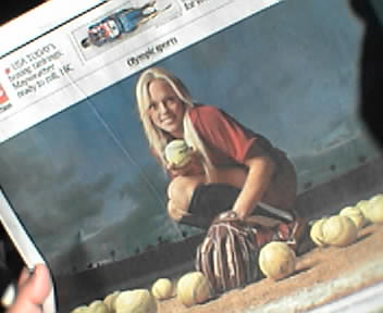 From a profile I read in USA Today this morning, it looks like Jennie Finch, pitcher for the U.S. Olympic softball team, will be a media darling this summer in Athens. Over 100,000 visitors to ESPN's web site voted Jennie the "Hottest Sports Personality," ahead of Anna Kournikova. Everyone interviewed in the article agrees that this talented, 6-foot-1 blonde will bring some much-needed attention to women's baseball. I'll be paying some serious attention myself. - mike lee - washington, dc |