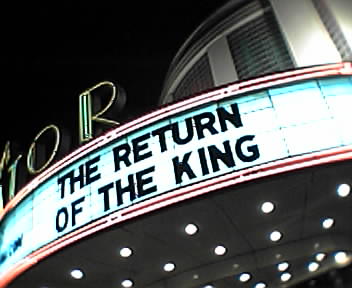 ![]() ![]() ![]() ![]() ![]() ![]() My sister-in-law and I Just got out of a showing of The Return of the King, which I finally decided to see without the company of my wife who still has to deal with a newborn baby constantly feeding at her chest. She was OK with waiting some more and will hopefully catch the movie with our baby at a Reel Moms day at a Loews theater in the coming weeks. What can I say about this epic that hasn't been said already? This is some of the best light to hit a silver screen, and an epic whose scope and quality will not be exceeded for a long time to come. I disagree with those that thought the ending was too drawn out. It seemed right to end this 12-hour story with a series of sentimental exits for each group of characters, and ofcourse the king had to be crowned. I can't see how ROTK won't win best picture, even against the excellent Lost in Translation. - mike lee - |