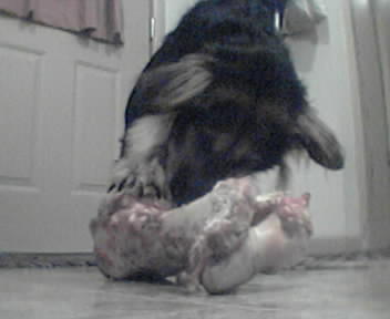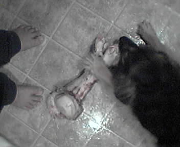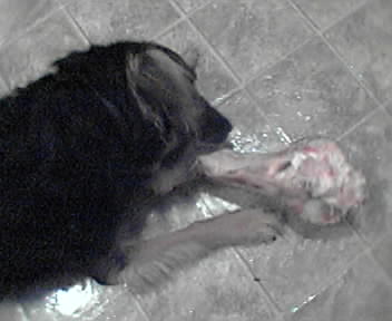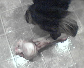 ![]() ![]() ![]() ![]() On a stop into Suter's Meats, an old-fashioned butcher shop on the main street in Greenville, Ohio, my father-in-law thoughtfully asked the butcher for a bone to give to our dog. The butcher, who must have been overcome by the holiday spirit--or just feeling mischievious--returned with a massive 10 lb. bone. Riding on the same seasonal spirit, we brought the bone home. The dog, not having heard the old adage that you shouldn't eat anything bigger than your head, eagerly attacked her prize, and must have been thinking, "I LOVE this country!" - mike lee - |