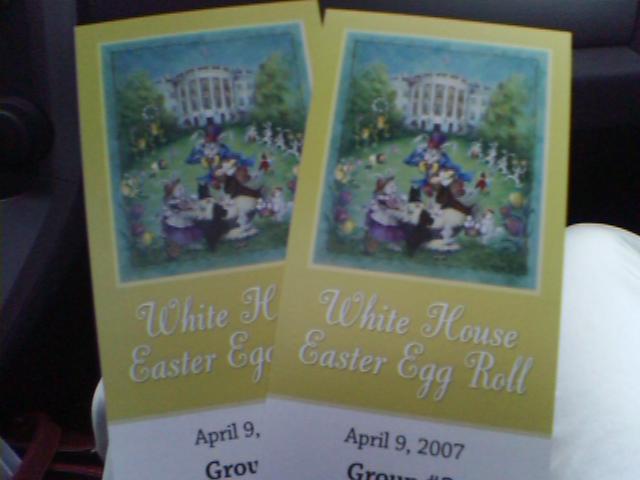 ![]() ![]() ![]() ![]() ![]() Our child spent part of her day at pre-school making a bunny-eared easter basket out of a gallon milk jug. She was quite happy to show off her mini-tiara. And mommy scored two tickets from her boss for Monday's White House Easter Egg Roll on the South Lawn. I'll drop them off early on my way to work. In bold type on the back of the tickets: No firearms, aerosols, backpacks, knives. - mike lee - washington, dc |
