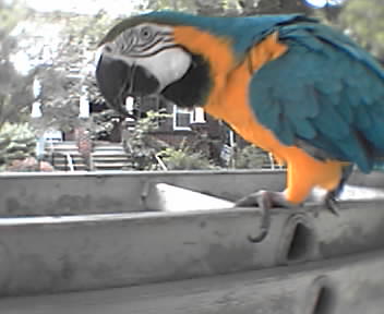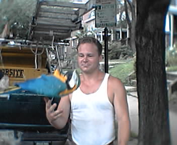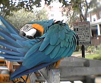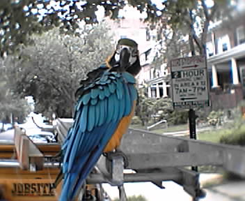 ![]() ![]() ![]() ![]() ![]() This is "Yago" the parrot. He hangs out on the top of a house painter's truck while his owner is working nearby. Yago says a few words like HELLO and GOODBYE, and can play dead. When I held the Sidekick camera up close for a portrait, he yelled ACK! His owner warned me that Yago likes women better and will sometimes snap at men. How convenient for Mr. House Painter! - mike lee - baltimore |