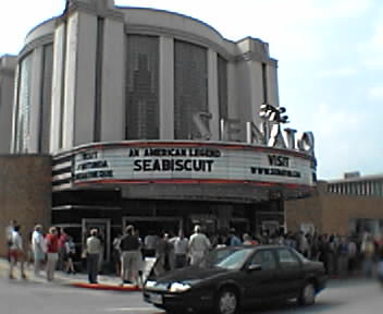 ![]() ![]() ![]() At the historic Senator Theater today, we were enchanted by the story of a legendary race horse named Seabiscuit. The story was masterfully brought to screen from a bestselling novel and the particulars have been well promoted so I won't thumbtype them here. Just go see this uplifting movie if you have the chance. - mike lee - baltimore |