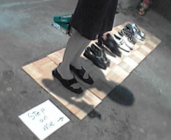 One for the home team: Stephen Turbek is an information architect at Razorfish NY. He also makes furniture. From the wall card: Happy Feet is an installation of 5 pairs of elegant footwear and floor sensors. The shoes are mechanically articulated to tap, create chorus line patterns, and dance with the audience. - mike lee - @ artbots |