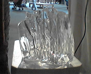 ![]() ![]() ![]() ![]() Robot directed building design: The robot sculpts a block of ice into an organic form using water (the water is stored and recycled by the robot). Every 8 minutes the sculpting stops and the model is presented for "client review". During the review period, visitors can influence the outcome of the sculpted model by making adjustments to a large control knob. They can choose between "Palatial Home", "Discreet Home", "Company Branch Office", or "Company Headquarters." The robot will do its best to create the home/office of their dreams. - mike lee @ artbots |