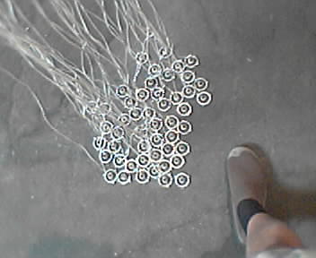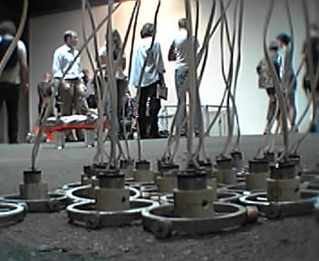 ![]() ![]() ![]() ![]() 50 drones: 50 drones consists of 50 individual aluminum and PVC units, which vibrate and interact with each other. This interaction creates spastic, unpredictable behavior and a persistent buzzing noise. Each unit is tethered by a 120 inch cord that supplies it with power and limits the unit's movement to a confined area. The piece is on a timer that allows it to run continuously for five minutes every hour. - mike lee @ artbots |