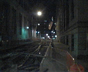 ![]() ![]() ![]() ![]() ![]() ![]() ![]() ![]() At NY Penn Station I hopped on one of the new six-seat cabs which rides high like our PT Cruiser, but isn't as cool looking. Snapping away down the West Side Highway towards the financial district, it was nice to see that the new Sidekick camera does a passable job on night scenes in the city. The cabbie was cussing up a storm about having to drive another guy's car. Arriving near the hotel, we discovered that Pine Street is now an open trench with utility pipes exposed. I got out on Wall, walked a half block, and was quickly checked in in the lobby. Got up to my 19th floor room to meet LITTLE SOAPS again! - mike lee - new york |