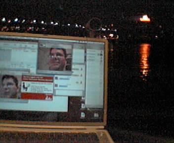 Success! With a willing conspirator back in Baltimore, friend Tim Windsor who runs Sunspot, I was able to do a two-way video chat using iChat AV from the 3rd floor balcony of South Street Seaport. The view is of the East River and The Brooklyn Bridge. Not knowing where exactly the Cornercast free WiFi was broadcasting, I had to walk around with my open laptop and MacStumbler to find the signal. Ofcourse it was in the place I thought of last--right by the food court. I connected with Tim easily--he was using a firewire camcorder and iBook from his home in Baltimore. I panned around the dimly-lit promenade and the various couples, a few tourists, and a homeless person didn't really take notice. There were actually some people nearby watching a DVD on a laptop. The Bridge and Brooklyn didn't show up terribly well. Late evening or twilight will be better next time. Though this wasn't really a massive technological achievement, it was astonishingly easy to set up two way video with basic hardware such as the PowerBook and iSight camera. This is more unwired experiential brain food. Now I have to work on my roving journalism skills, but I think Edison Carter would already be proud. - mike lee - new york |