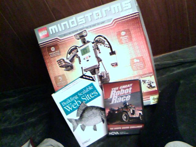 ![]() ![]() ![]() ![]() I returned home tonight in the monsoon rains to find a bunch of packages. The Lego Mindstorms NXT arrived! I pre-ordered it months ago. More detailed photos on Flickr. Building Scalable Web Sites The Flickr Way looks like great reading on how large scale web sites like Flickr were built with open source software. NOVA: The Great Robot Race is out on DVD. I saw the winner, Sebastian Thrun, speak at Stanford earlier this year. This is a great story. My order of OSRAM Dulux Mini flashlights also arrived from Solvenia. The Bud Plant catalog is always a treat to flip through. There's a book on every page that I want. - mike lee - wheaton, md |
