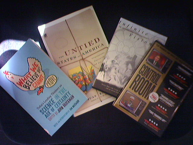 ![]() ![]() ![]() I can't believe it's been a year since the president of my company said, "Mike, you must go to TED." TED 2006 starts next week in Monterey, CA, and today, I got the last shipment from their year-long book club: What We Believe but Cannot Prove : Today's Leading Thinkers on Science in the Age of Certainty, edited by John Brockman. This book title's question was posed on Edge.org (an online intellectual clearing house), challenging more than 100 intellectuals of every stripe—from Richard Dawkins to Ian McEwan—to confess the personal theories they cannot demonstrate with certainty. The results, gathered by literary agent and editor Brockman, is a stimulating collection of micro-essays (mainly by scientists) divulging many of today's big unanswered questions reaching across the plane of human existence. The Untied States of America : Polarization, Fracturing, and Our Future, by Juan Enriquez, who is a former Mexican government official and fellow at Harvard's Center for International Affairs. He says growing political, racial, and economic divisions in the U.S. could provoke secessionist movements in the South and New England. Control Room (2003), a documentary on perception of the United States's war with Iraq, with an emphasis on Al Jazeera's coverage. Infinite Vision: Dr. Govindappa Venkataswamy. This is a documentary on Dr. V, the legendary eye surgeon from South India who made it his mission to restore sight to the blind and whose work has resulted in one of the world’s most extraordinary models of service delivery. The video on Dr. V was 35 minutes long, just right for watching while I ate a sandwich at the National Building Museum. His is a deeply inspiring story. - mike lee - washington, d.c. |