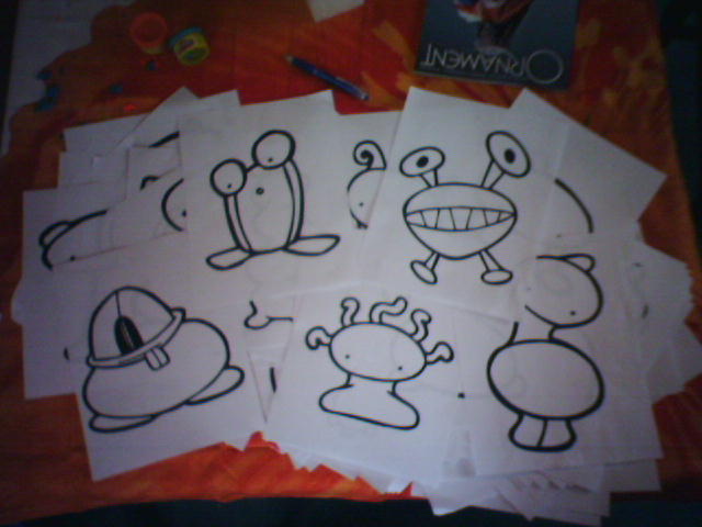 Jenna sent us 80 digital drawings of little aliens to use as decoration for Cianna's bedroom. Amy made them into coloring pages so Cianna could pick out some of her favories. Rainy Saturday fun. - mike lee - wheaton, md |