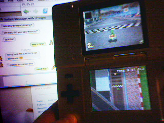 I tried Mario Kart DS tonight over wifi and the internet with co-worker Kathy tonight. The setup was easy and the racing experience was smooth. It's mindboggling to think about the 6,000 McDonalds that are offering free wireless gaming access for these devices. - mike lee - wheaton, md |