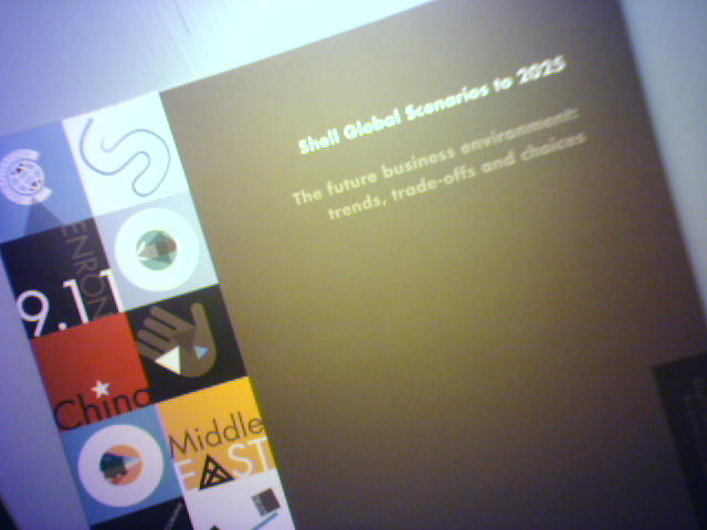 ![]() ![]() ![]() After Amazon sat on my order for a month, I finally got my copy of Shell Global Scenarios to 2025 - The future business environment: trends, tradeoffs and choices. The book is part of a series of studies at Shell spanning three decades using the technique of scenario planning to imagine multiple plausible futures (stories) as a tool for strategic planning. For me, scenarios are a way to sort out predictions of the future that range from "the world is totally f-ed," to "a prosperous technology-driven long boom for all." Notes: 1.5mb, 24-page PDF excerpt of the Shell scenarios ... the CIA offers their version ... EPIC 2015 flash video ... Google 2084 ... and The Man Who Saw The Future. - mike lee - wheaton, md |
