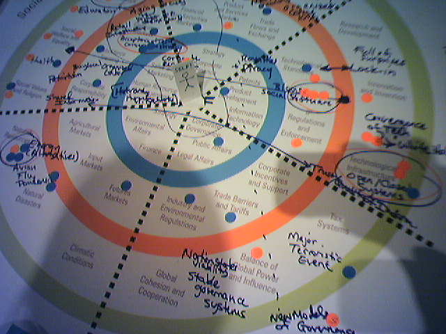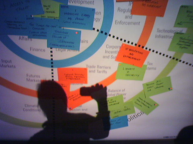 ![]() ![]() ![]() ![]() ![]() ![]() ![]() After my luggage arrived at the W at 2:30am, and then finally getting a few hours sleep, I'm at the Yerba Buena Center for the Arts Forum building to begin the GBN annual forum Navigating The New Realities of Risk. That's me in the last frame with GBN's graphic recorder, Lynn Carruthers. She had just given me a great tip on using baby butt wipes to smooth pastel tones on facilitation diagrams. She said to be sure to wipe in one direction... Eamonn Kelly introduced the day; now, after introductions around our tables (Robert Horn is two chairs away!), Rebecca Weyland and Lawrence Wilkinson are leading the day's activities. - mike lee - san francisco |