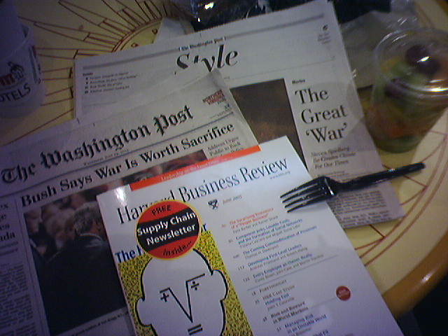![]() ![]() ![]() I'm heading to Ft. Lauderdale, Florida for meetings at our call center today and tomorrow. At 5:45am, the 12 mile stretch of The George Washington Memorial Parkway between the Beltway and National Airport was easy. I got to the U.S. Airways terminal early to get breakfast. My reading was the Post's stories on last night's Bush speech, Spielberg's War, and Davenport's HBR article, The Coming Commoditization of Process. Looks like my flight is on time... - mike lee - washington, dc |