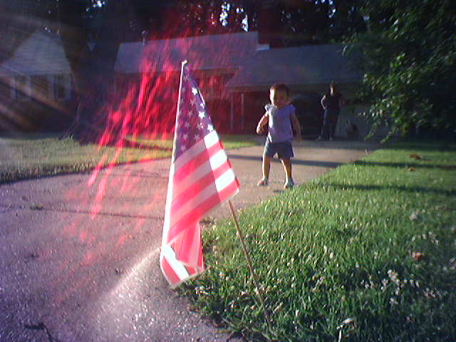 ...for real this time. Mommy returned from Montreal this evening with a little moose-in-flannel-shirt doll for baby which she enjoyed. We said goodbye to grandma, who's been watching baby for three days, and headed over to our house. As we drove up, Neighbor Cindy handed us a pool party flyer for Adam's house down the street, and we met another neighbor, Kathy. Pictured here is our copy of the flags that have been planted by someone at the end of every driveway on our street. Cianna can say flag now; daddy can say dose of patriotism delivered to my door. - mike lee - wheaton, md - jeff, got your note, call you tomorrow... |