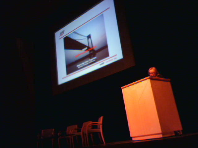 ![]() ![]() ![]() ![]() ![]() ![]() I spent most of today at the Amphitheater (1) of the Reagan Conference Center on Pennsylvania Avenue at our annual product provider summit. They are collectively responsible for the $8 billion in sales that generates $800 million in management fees, 95% of which our organization plows back into its social mission. Our subsidiary is delivering presentations (2) today and tomorrow as are the product partners. This year is different because we have three new senior vice presidents who are networking up a storm with execs from places like The Hartford, Travelocity, Avis and United Healthcare. But also, big business events at our company mean decent swag. The event bag contained the usual notebook and literature plus a copy of our new sex book (3) and a submersible digital camera (4)! At the lunch of filet mignon and shrimp with fancy desert (5), I was one of the people who had a gold ribbon on a chair leg and won the New Orleans-themed table setting (6). In the afternoon, I gave a short presentation on my activities at MIT and Stanford, after which I got a bunch of business cards on my offer to give a tour of the Media Lab to anyone who could make it to Cambridge, MA. No surprise there. - mike lee - washington, dc |