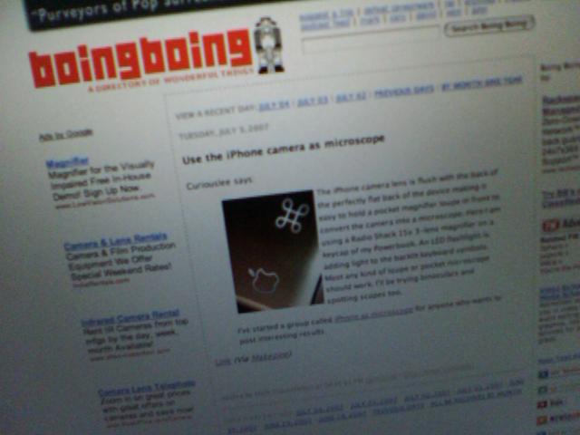 ![]() ![]() ![]() ![]() I got over 10,000 hits to my Flickr stream in the last 24 hours because Make Blog and Boing Boing linked to my close-up photo experiments with the iPhone camera and Radio Shack 3-lens magnifier. This is the same technique I documented here back in January 2005. I'm going to continue to post iPhone related photos in a set on Flickr. My neighbor Jeff is agonizing over buying an iPhone. He's post an iPhone Lust-O-Meter on his blog. He should enter the leather folio belt case made by Incase. One of the best iPhone reviews I've seen to date is on Engadget. - mike lee - happy 4th - wheaton, md |