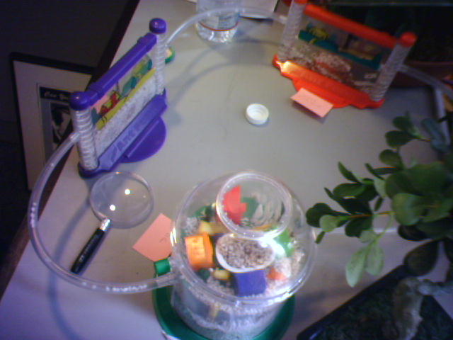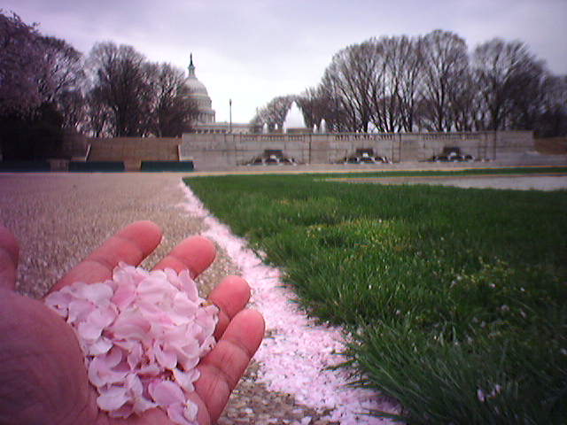 ![]() ![]() ![]() ![]() ![]() I finally paused for a few minutes in our cafeteria this morning to try out the building-wide WiFi. It works very well with Rendezvous on my PowerBook (1). With our remote desktop capability, I can access anything I need on our network while roving around the building. I can fill out my timesheets anywhere--woo hoo! I also got an alert from eBay that I was the winning bid on the hard-to-find RFID-enabled toy, Ellie's Enchanted Garden Playset (2), which I can hack with Prof. Maeda's help to build a sensetable. At lunchtime, I spent a few minutes admiring our art department's Mini Ant Farm (3 & 4). It's fun watching the daily dramas that unfold in our very own ant society. I found myself a FAQ to read up on ant care. Now, I'm taking a moment to admire the pink snow of cherry blossom petals (5) in the park on the north side of the U.S. Capitol. The blossoming trees add some welcome color to the grey day. I'm off next to Union Station to rent a car for the weekend's house move operations. - mike lee - washington, dc |