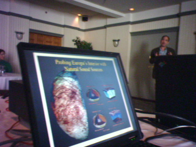 ![]() ![]() ![]() ![]() ![]() After a buffet lunch by the (1), Dan Ariely and John Maeda (2) welcomed the attendees (3) to the sponsor workshop. The first guest speaker was Nicholas Makris of the MIT Department of Mechanical Engineering (4 & 5). Nick talked about his work with NASA in studying the tidal cracks in the ice surface of Jupiter's moon Europa as a possible entry way for future space probes to reach the subterranian sea of liquid water. In another project, Nick's team was tasked to image the ocean floor off the continental shelf off Long Island. In a surprise discovery, the sonar data was able to image entire schools of fish 10km wide. Observations of the course of single days yielded never-before-seen insights in to how schools of fish form and break up. - mike lee - cape cod |
