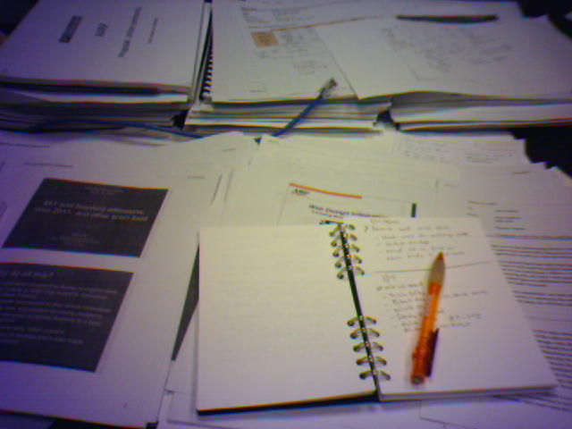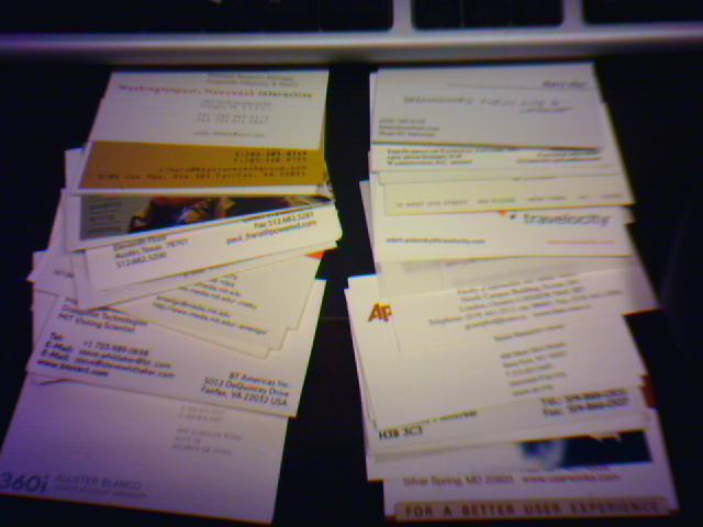 ![]() ![]() ![]() ![]() I opened Outlook this morning to realize that I had NO meetings scheduled for today (1). This wasn't because there was nothing going on. I had reserved the day for a possible trip, but diodn't end up going. I had high hopes that I would clear the two weeks worth of paper on my desk (2) or start logging the last six weeks' collection of business cards (3). But then at lunch, I learned of several important meetings in the afternoon and gave in to my calendar. At least I got to look at some cool photos (4) that are being displayed as inspiration for the new office space we will move to late this year or early next. - mike lee - washington, dc |
