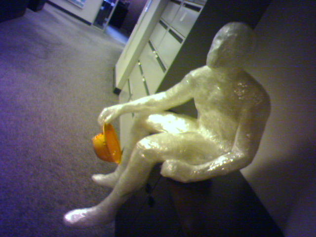 ![]() ![]() ![]() ![]() I dragged myself through a normal day today while in post-flu haze. Here are some snaps from lucid moments: (1) Boss Mark started our afternoon staff meeting with a "First Five"-minute talk on how he uses Flickr to syndicate phonecam pictures in real time to his blog. (2) Chris did a second First Five on the cool developer's extensions available for Mozilla Firefox. The yellow hard hats you see are to promote the upcoming relaunch of our web site. Each one has a project logo sticker and is personalized with the name of the recipient. We're giving them out to dozens of staff and clients at a "Hard Hat Tour" we're doing Thursday morning. (3) After the staff meeting I admired a new addition to our staff art gallery: a sculpture of a human figure made from 30-50 rolls of clear packing tape by Mark Jenkins, one of our production designers. (4) I'm checking snow conditions on web cams tonight as I'm in NYC for a meeting with a product partner tomorrow night and all day Wednesday, and at a conference in Montreal Friday thru Monday. - mike lee - langley park, md |