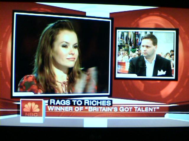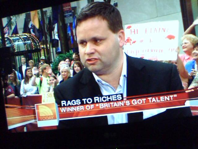 ![]() ![]() ![]() ![]() No, it wasn't a nightmare about buying the iPhone. It was Paul Potts' performance of an operatic aria on the Today show this morning. Paul (really a cell phone salesman) won the top prize a few days on the TV show Britain's Got Talent. This was his first trip to America, and the first time a large US audience has seen him on television. He's returning to England right away to record his first album, which will be released in a month. He's also scheduled to perform for the Queen. On YouTube: First audition - Nessun Dorma, semi final with mini-documentary, winning final performance. Amazing. Watch. - mike lee - wheaton, md |