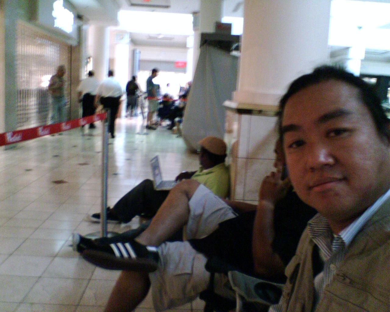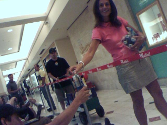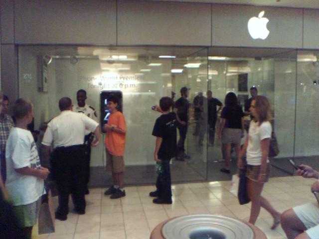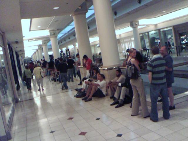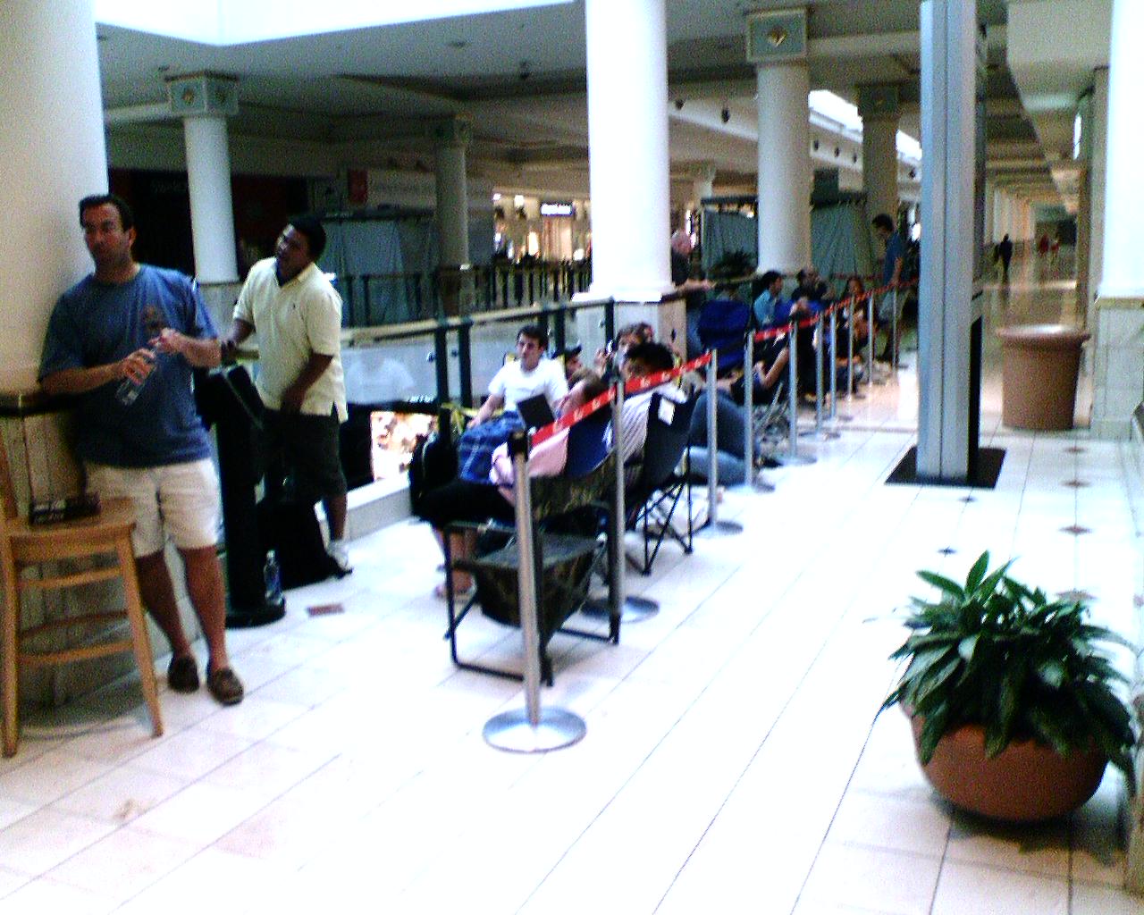 ![]() ![]() ![]() ![]() Well I'm definitely no Greg Packer as I sit here in the air conditioned Montgomery Mall about 25th in the iPhone line in front of the Apple Store. I got here at about 9:15 and stores opened at 10. The mall perimeter doors were apparently unlocked at 7am and a group of about 15 high school and college students who had camped out in the parking lot all night marched in to start the line. There are two security guards in front of the Apple Store who got on my case for taking pictures. Whatever. I'll be moblogging all day, so check back. - mike lee - 7 hours to go before I buy my iphone here at montgomery mall |