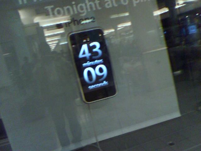 ![]() ![]() ![]() The store re-opened at around 5pm with the big iPhone displays showing a countdown for the final hour. There are now rows of demo iPhones set up inside. My next door neighbor and her daughter came up unexpectedly. They weren't here to buy the iPhone; they need to consult with someone at the Genious Bar about their new MacBook. I told them this would be a bad night to try to get help. Checking the back of the line, it looks like about 150 people. The three guys behind me turned out to be day laborers who were being paid to stand in line to buy a bunch of phones for someone. - mike lee - montgomery maul, md |