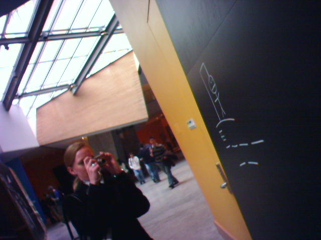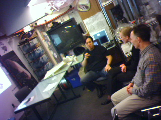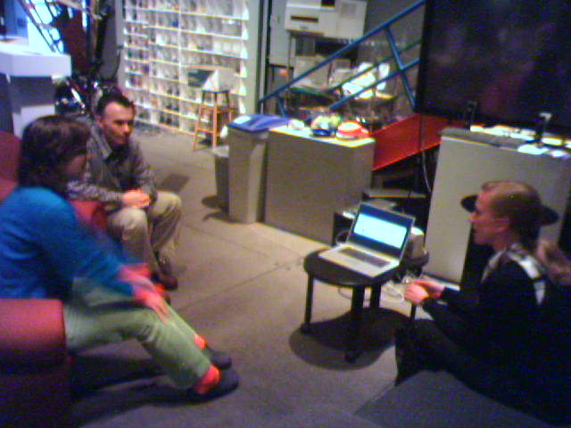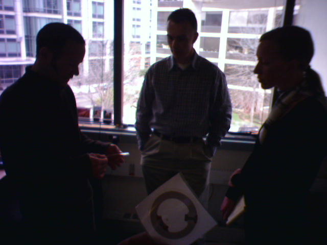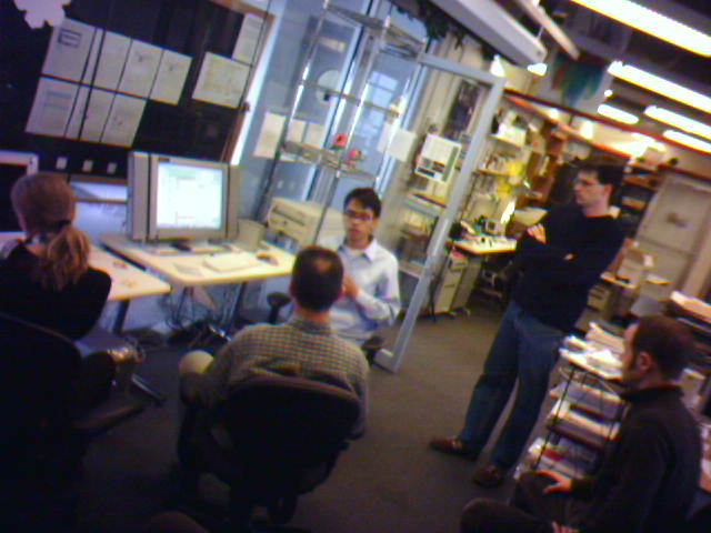 ![]() ![]() ![]() ![]() Carlos, Noah and Kelly of John Maeda's Physical Language Workshop are giving my colleages Amy and Michael the background on the group's projects. Among other things, we're looking at a prototype of a sensetable, which can simultaneously track the location of several specially-tagged pucks (3), and Noah is demoing the custom-built RFID reader module (4) as applied to navigating large digital picture picture archives. - mike lee - cambridge |